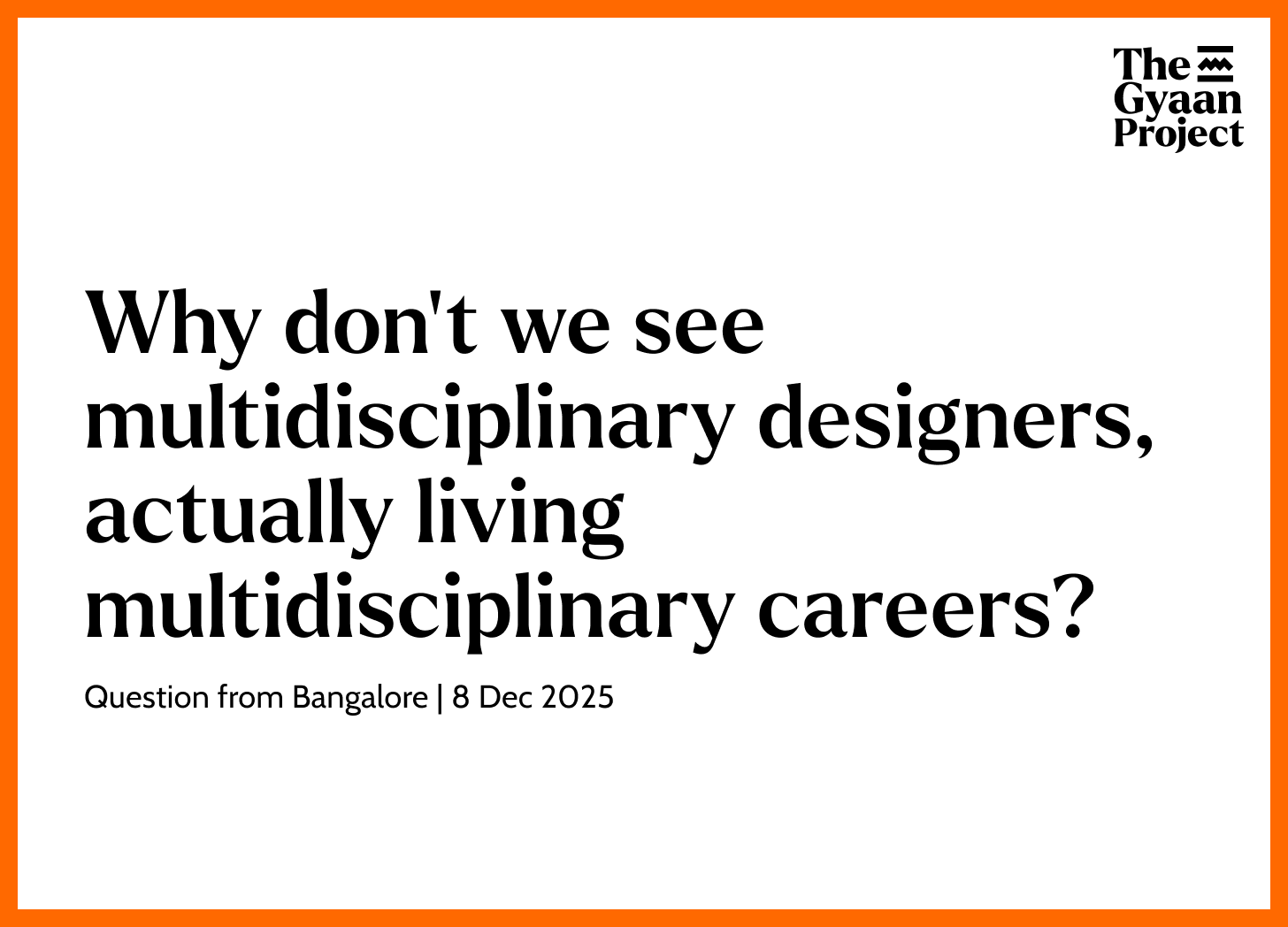 I’ve published a form where design and art students or early career professionals can ask any question they have around career, design philosophy, tools, skills, or anything that’s a creative roadblock in their way. This link will always be open for ongoing questions. I will be answering a few of these in long form episodes in our Off Grid episodes - so please do subscribe to the The Gyaan Project Youtube Channel.